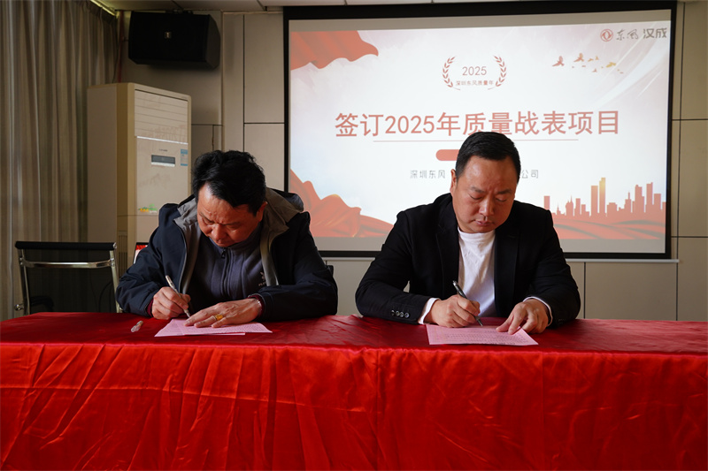 在质量战表项目签订环节,深圳东风董事长刘刚与技术工艺部、品质采购部、部品车间、总装车间主要负责人,逐一签订2025年质量战表项目书。结合[敏感词]的目标分解和具体的提升方案,从上至下统一行动,将“质量年”活动贯彻到每一个研发、采购、生产、服务各环节,形成全方位、全流程的质量管理实施氛围。